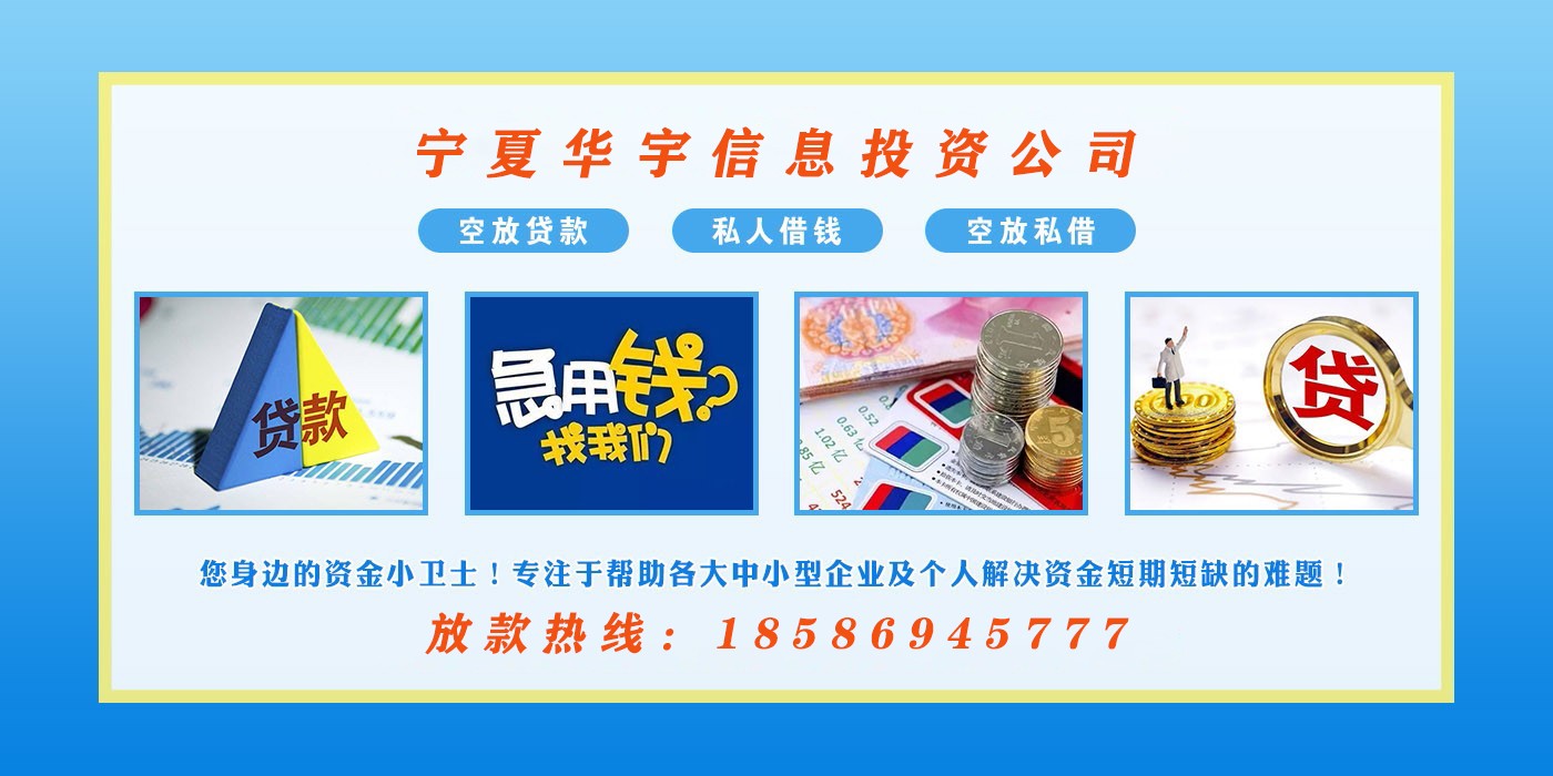 宁夏华宇信息投资公司(18586945777)是一家专业信贷服务机构,利息低,放款快!业务主要包含宁夏地区空放,私人借钱,私人放款,民间个人借款,应急周转借款。已为上万客户解决资金问题。