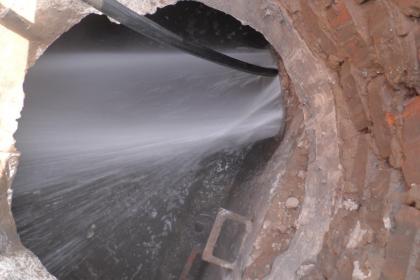 【清洗车疏通】使用高压清洗车进行管道疏通,将高压清洗车水带伸入上游检查井低部,把喷水口向着管道流水方向对准管道进行喷水,污水管道下游检查井继续对室内淤泥进行吸污。